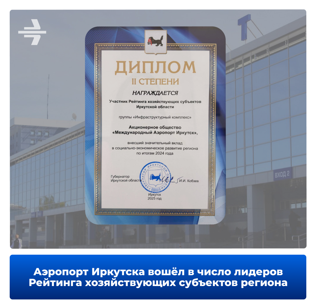 По итогам 2024 года аэропорт Иркутска получил диплом II степени как участник Рейтинга хозяйствующих субъектов Иркутской области в группе «Инфраструктурный комплекс».